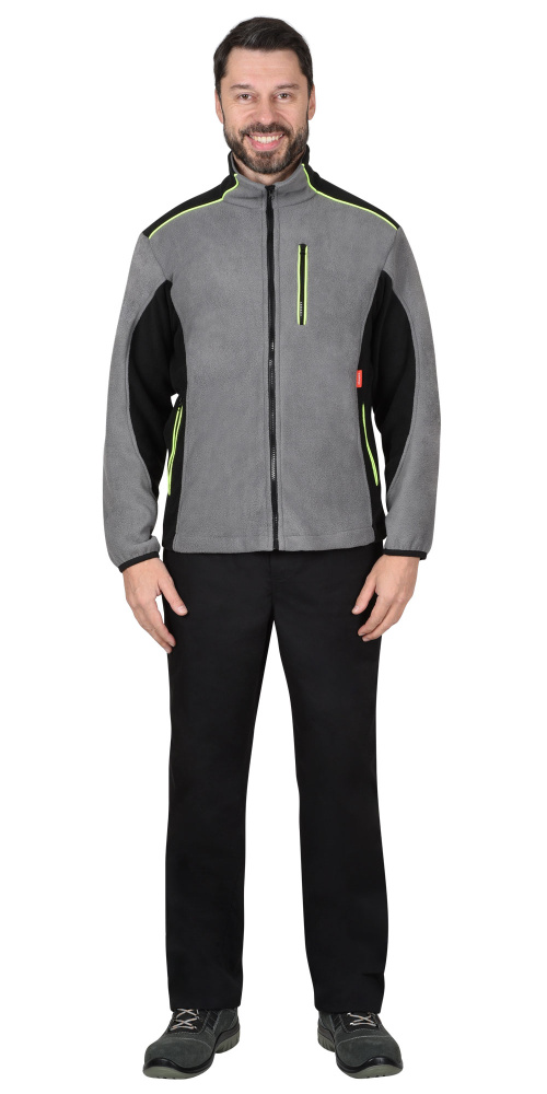 Демисезонная флисовая куртка «СИРИУС-ТЕХНО» выполнена в универсальном сером цвете с черными акцентами.
