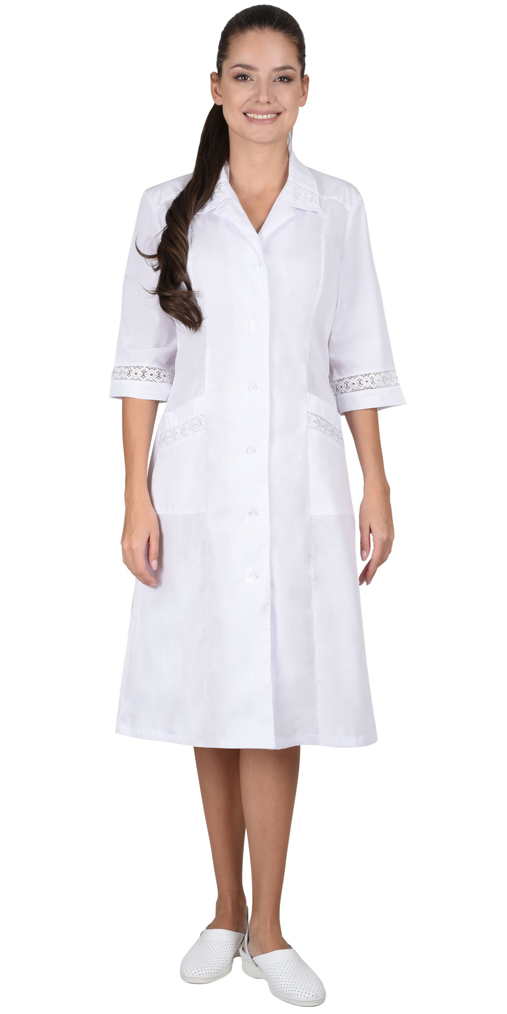 Женский халат "АДЕЛЬ" в классическом белом цвете предназначен для сотрудников медицинской сферы – врачей, лаборантов, работников лечебных, профилактических и прочих учреждениях.