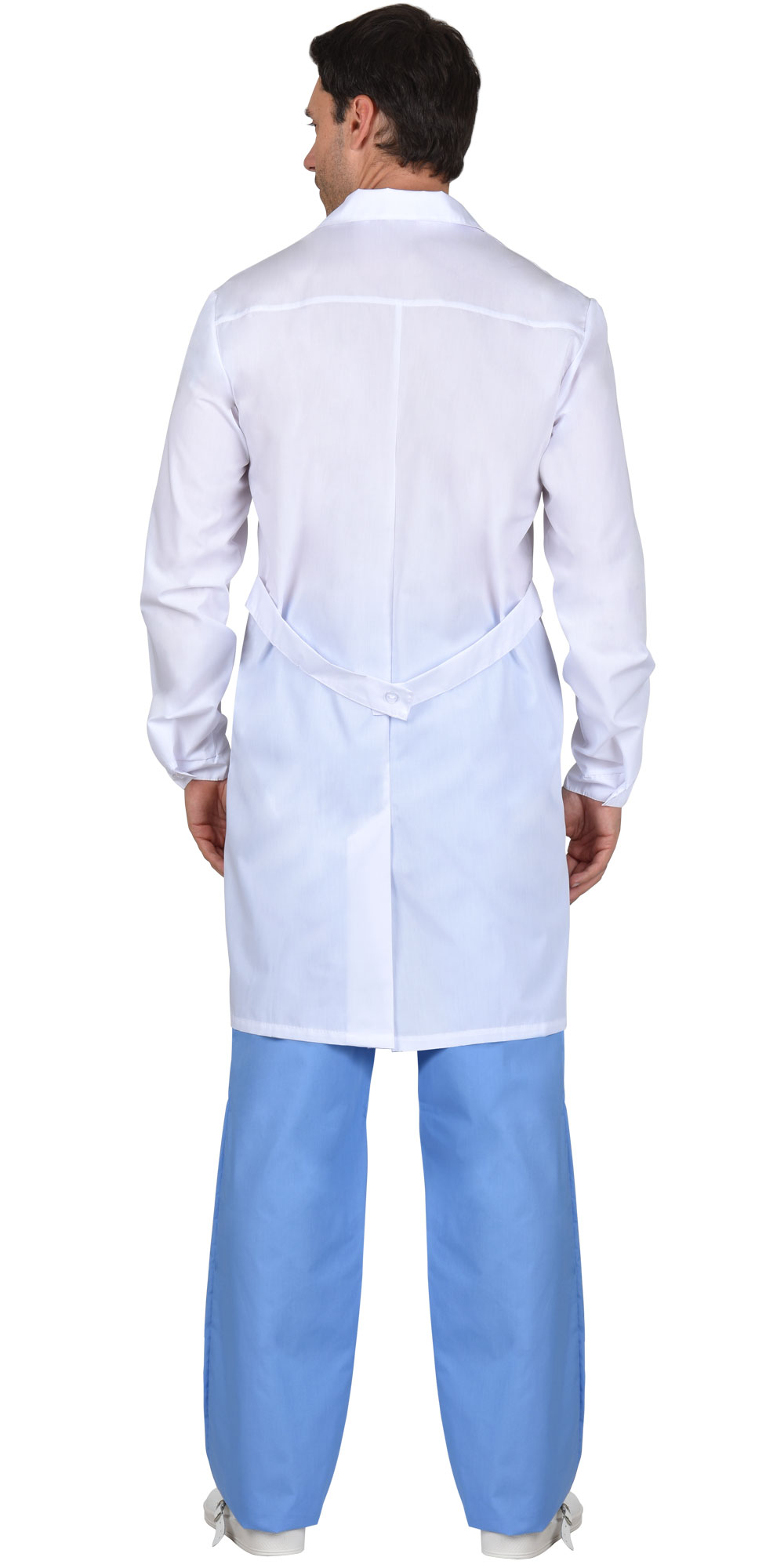 Ширина по линии талии регулируется хлястиками на пуговице, позволяя адаптировать халат к различным типам фигур. Двойной нагрудный карман с левой стороны подходит для хранения небольших вещей. Боковые накладные карманы рассчитаны на размещение необходимых в течение смены мелочей.