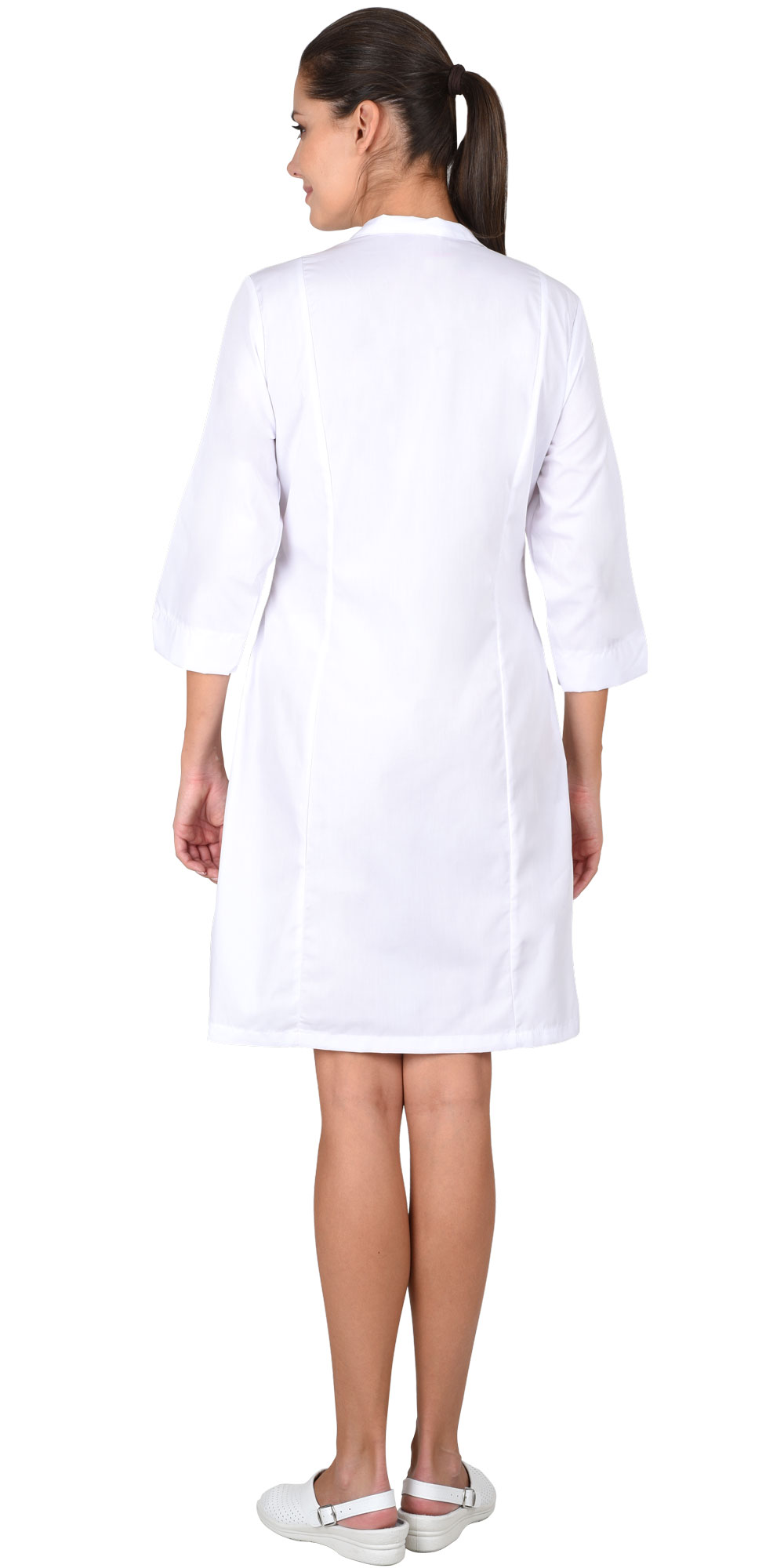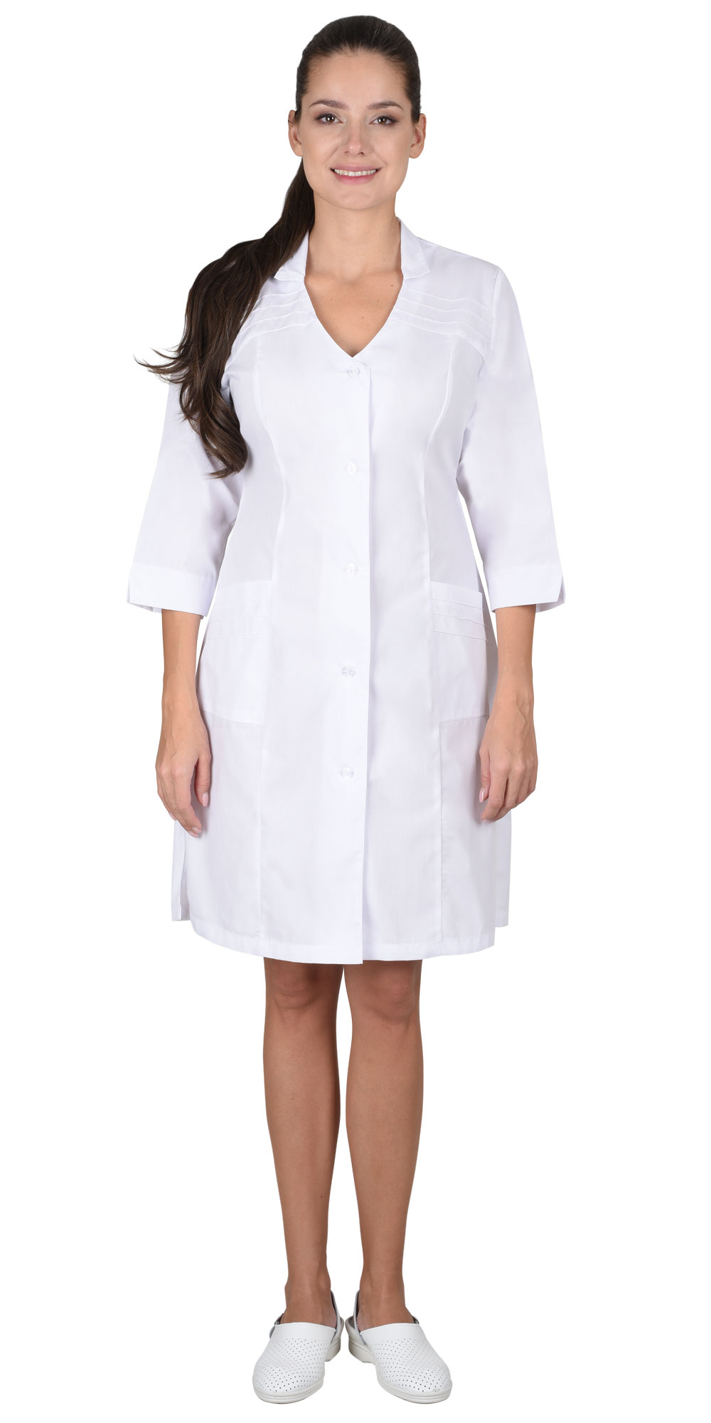 Отложной воротник с V-образным вырезом способствует свободной циркуляции воздуха в области шеи и нагрудной зоны. Рукава ¾ удобны при выполнении процедур и работы с инструментами, снижая риск случайных зацепов за оборудование.