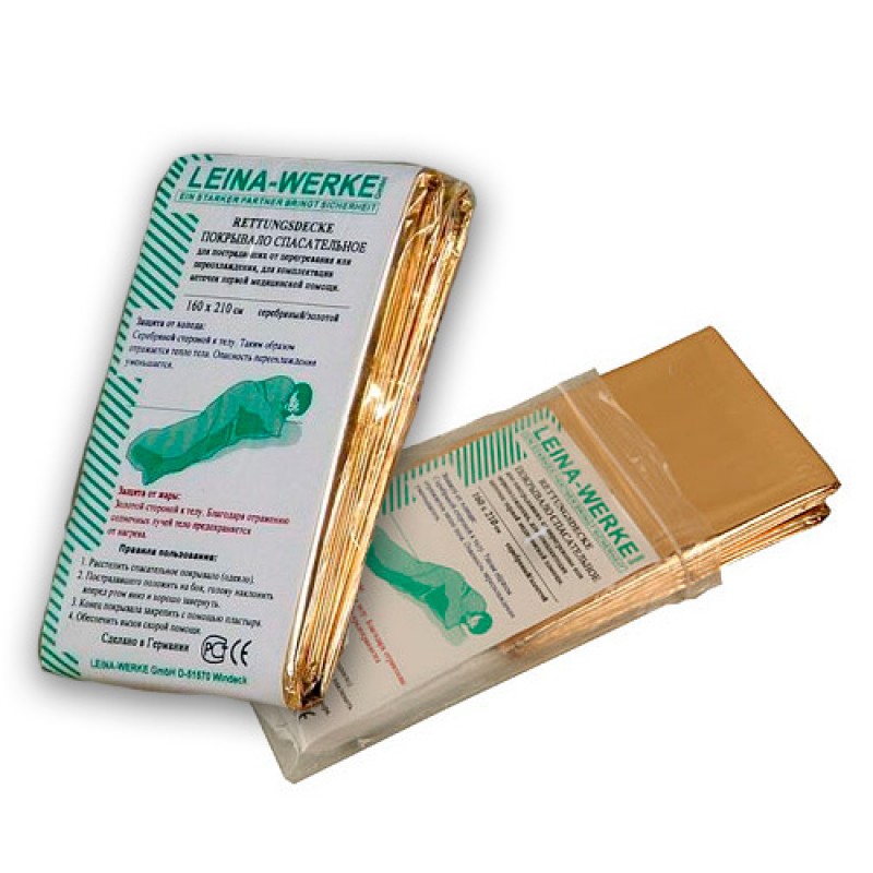 Покрывало спасательное из полиэфирной пленки с металлическим напылением серебристого и золотистого цвета с разных сторон. При несчастном случае, покрывало защищает пострадавшего от переохлаждения или перегрева в течение 20 часов, а также предохраняет его от осадков. Материал покрывала нейтрален к телу человека, не прилипает к ранам и ожогам, способен выдержать вес человека при ручной транспортировке. Покрывало облегчает визуальный и радиолокационный поиск людей, терпящих бедствие, благодаря яркой отражающей поверхности.