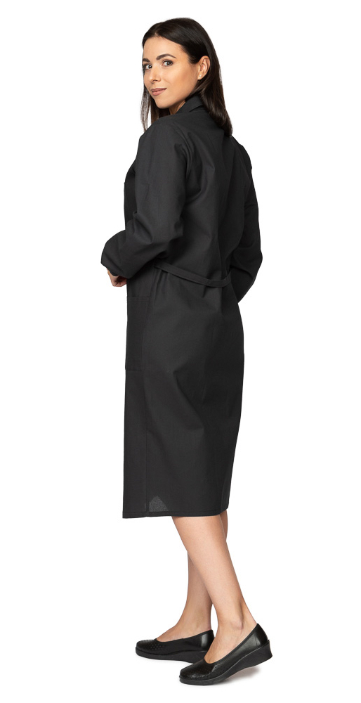 Пояс по линии талии со стороны спинки позволяет легко адаптировать халат под фигуру, при необходимости делая объём более свободным. Один нагрудный и два боковых накладных кармана предлагают достаточно места для необходимых мелочей, которые могут понадобиться в течение рабочего дня.