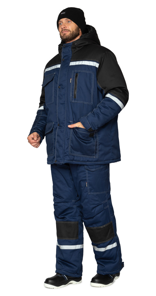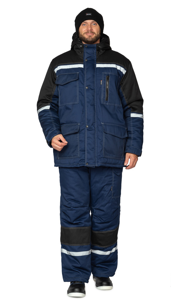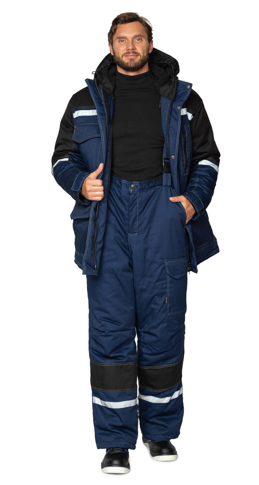 Утеплённый костюм "АЗИМУТ" в тёмно-синем цвете с классическими чёрными вставками – качественный вариант для комфортной работы в зимний сезон. Костюм имеет 3, 4 класс защиты от пониженных температур и может использоваться в IV-м и Особом климатических поясах.