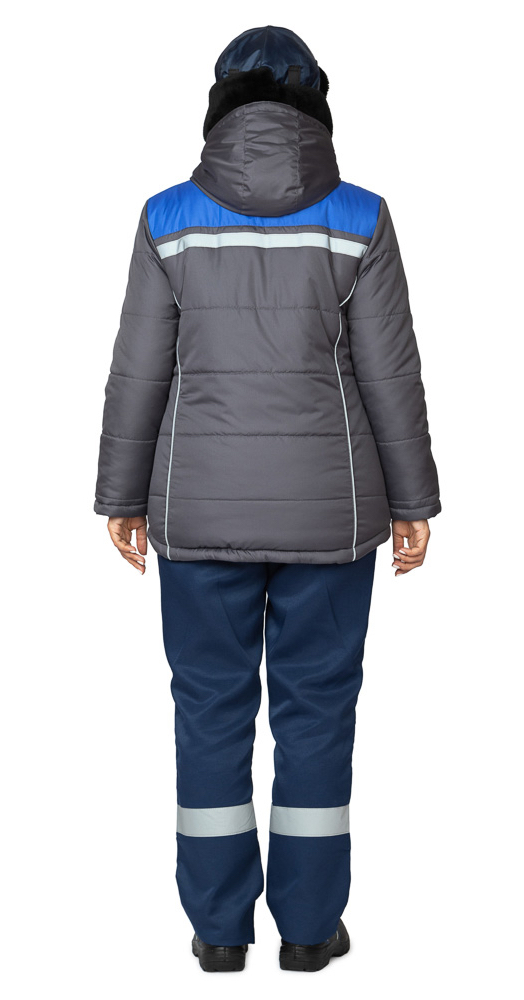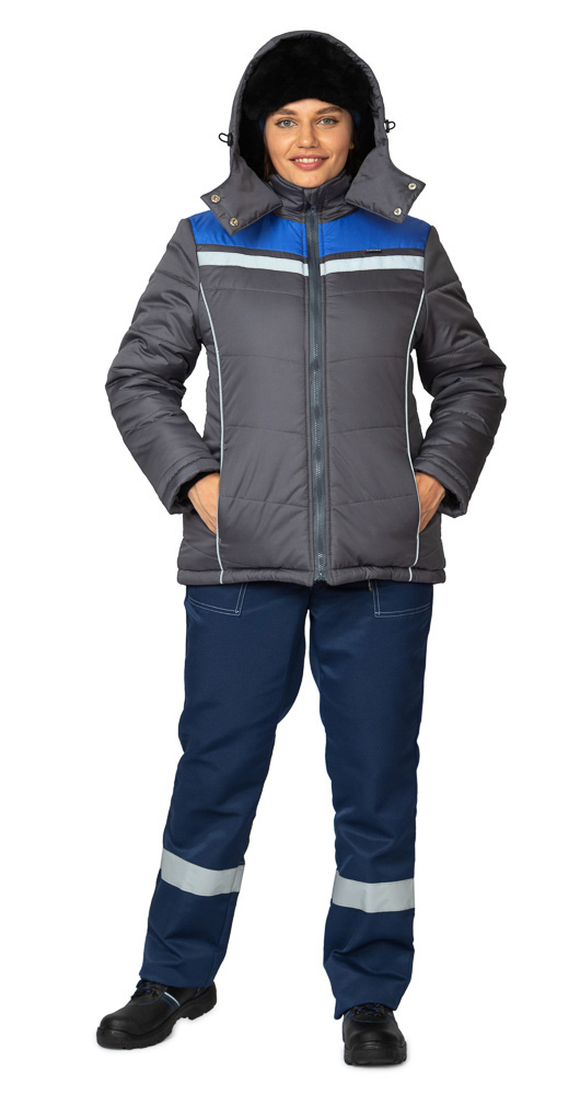 Женская утеплённая куртка "ОНЕГА-М" в тёмно-сером цвете с васильковыми вставками – современный и практичный вариант для работы и повседневной носки в зимний сезон. Модель имеет 2 класс защиты от пониженных температур и может использоваться в III-м климатическом поясе.