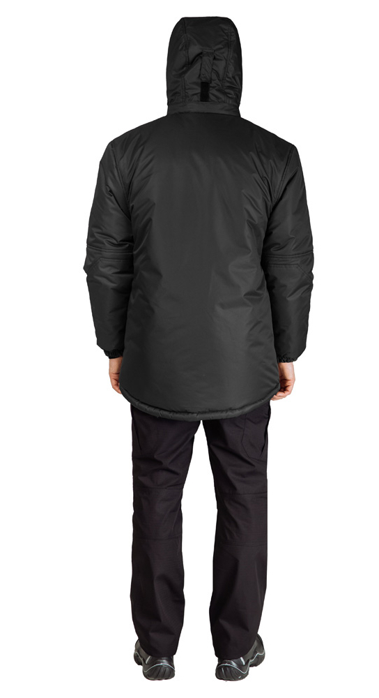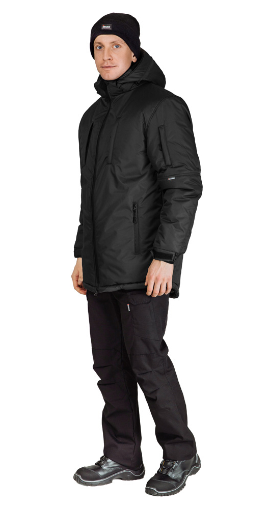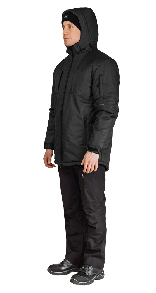 Съёмный утеплённый капюшон с кнопками на подбородочных частях для крепления к воротнику обеспечивает дополнительную защиту в холодную и ветреную погоду. Капюшон пристёгивается к горловине на молнию с планкой, а регулировка по лицевому вырезу предотвращает попадание осадков внутрь изделия. На затылочной части хлястик на липучке позволяет регулировать глубину капюшона.
