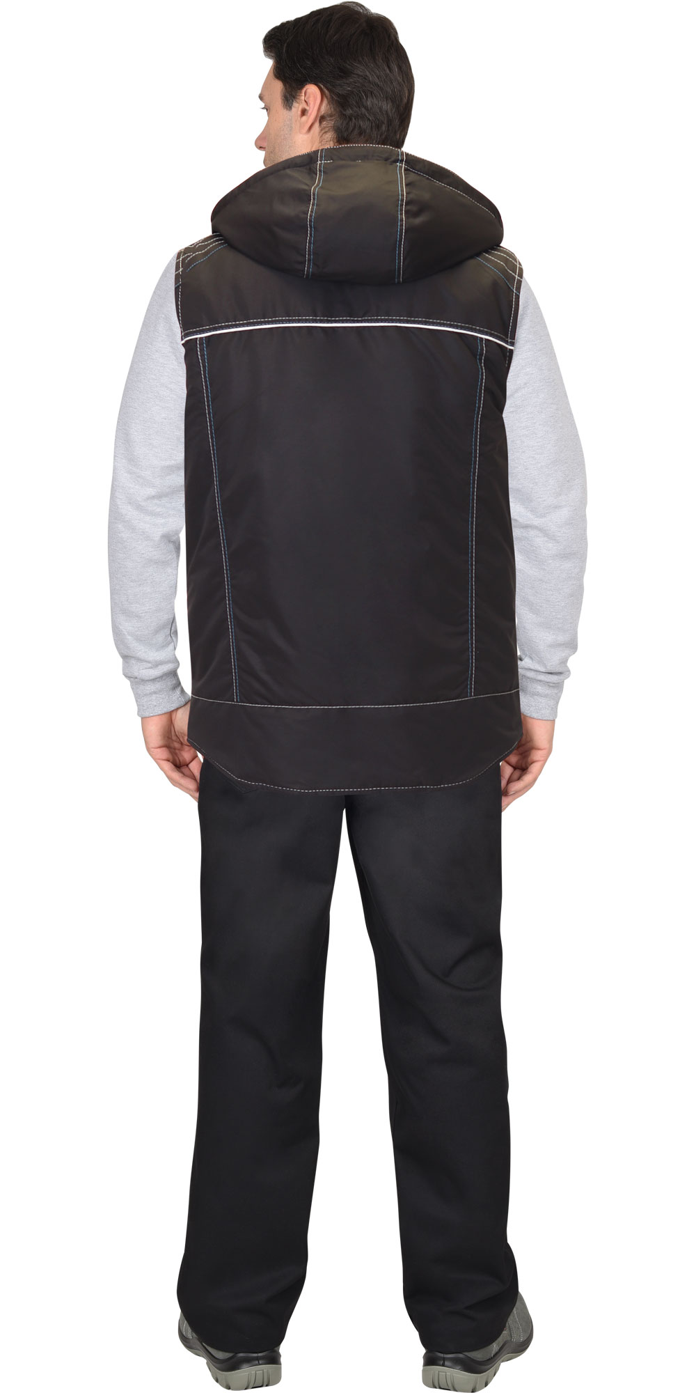 Съёмный капюшон легко пристёгивается и отстёгивается с помощью молнии. Он оснащён шнуром с фиксаторами, что позволяет настроить его посадку по лицевому вырезу. Отделочные строчки и контрастный отделочный кант придают жилету дополнительную прочность, а контрастный отделочный кант подчёркивает конструкцию изделия.