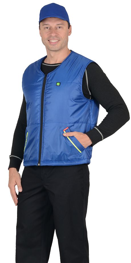 Утеплённый жилет "КАССИР" в васильковом цвете предназначен для профессионалов сферы обслуживания и отлично подходит для работы в неотапливаемых помещениях.
