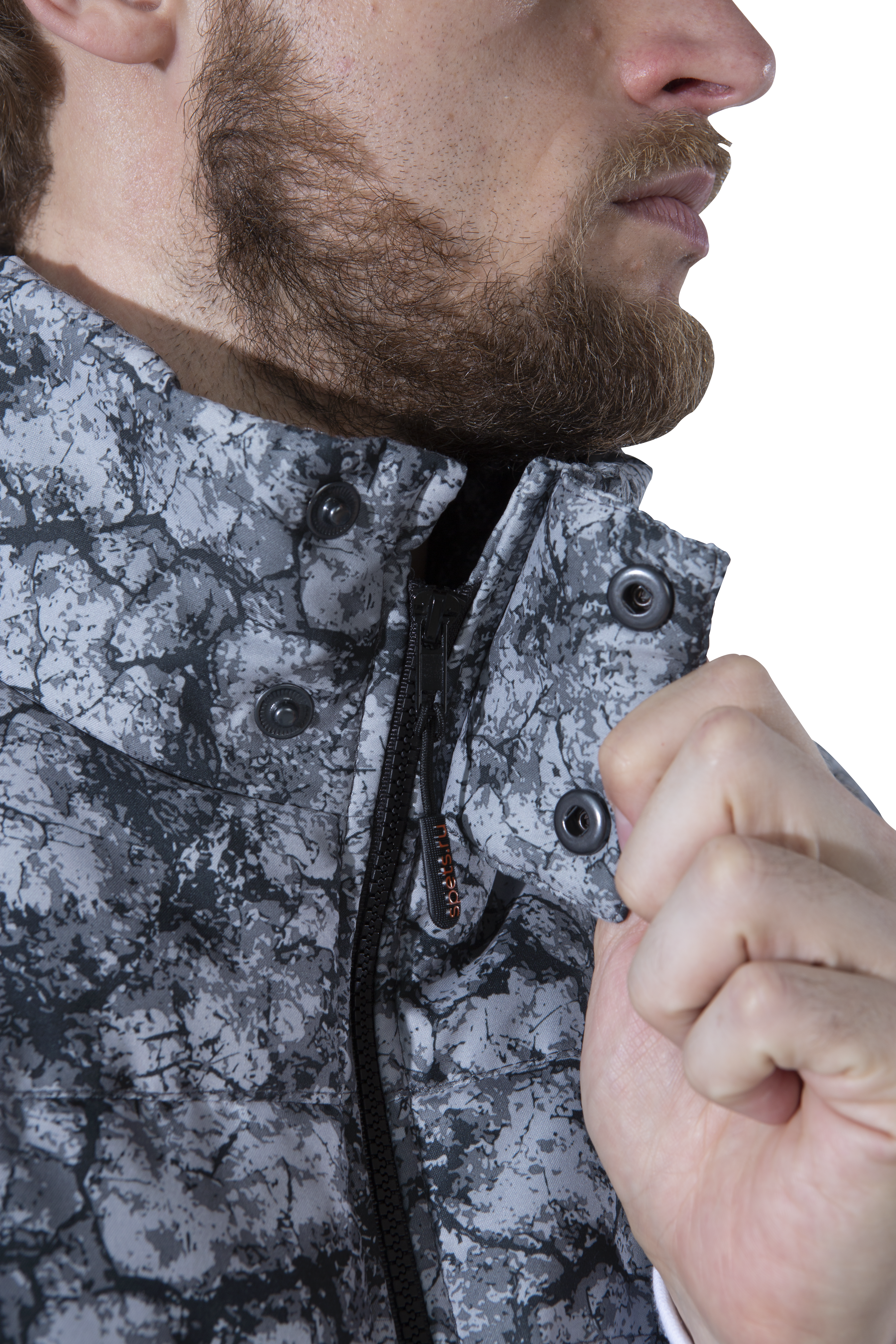 Модель имеет центральную застёжку на молнию, что обеспечивает лёгкость использования. Высокий воротник-стойка с планкой на кнопках дополнительно защищает горло от ветра, не давая ветру задувать через молнию.